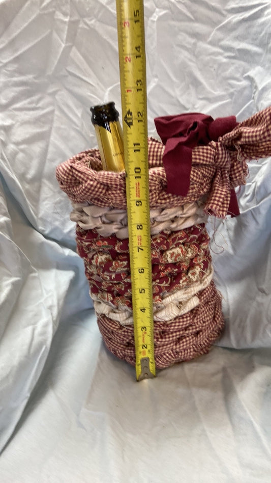 Maroon and Beige Handmade Fabric Basket for a Wine Holder/ gifts or accent . Removable Bow